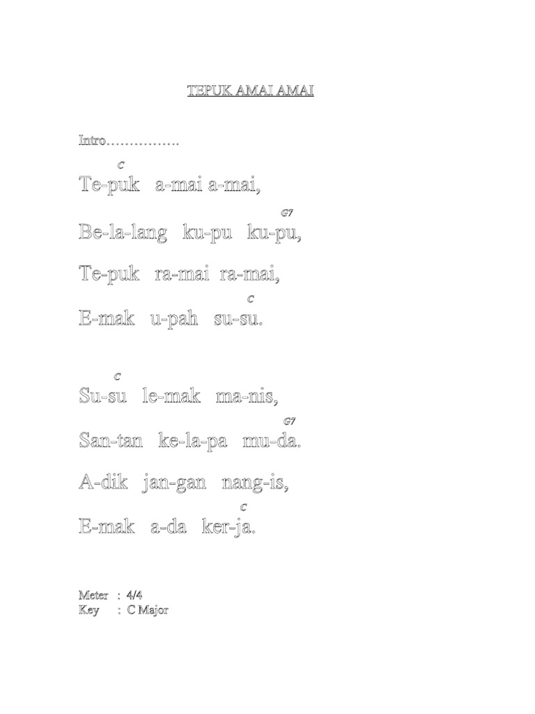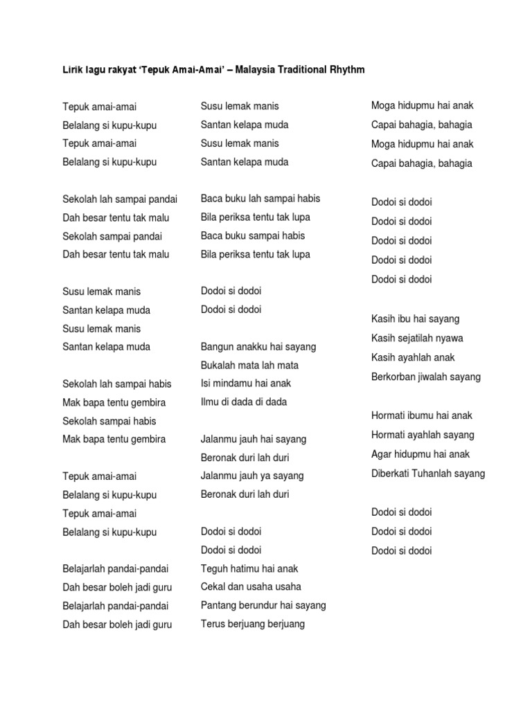 Clap hands with the ladybugs Grasshoppers butterflies Lets clap as. Lirik Lagu Tepuk Amai-Amai. Ingatlah adik adikku sayang Ketika kau di dalam buaian Kau didodoi dan dibelai manja Oleh insan yang menyayangimu.